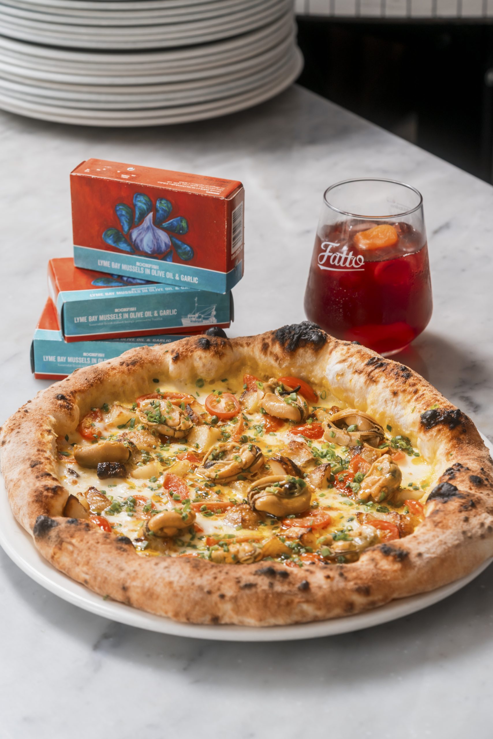 The mussels on this pizza are from the amazing team at Rockfish. Rope grown and harvested from Lyme Bay in Devon, they are steamed, lightly fried and packed in olive oil which has been infused with garlic and chilli. The. cream base has been gently simmered with shallots and saffron. We top with mozzarella, roasted new potatoes and tomatoes and then add the mussels and chives when it’s hot from the oven.