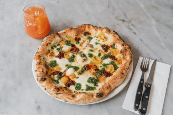 La Ribelle brings the sweetness of yellow cherry tomatoes, spiciness of ‘nduja and saltiness from the delicious Cetara anchovies and buffalo mozzarella. Out of the oven, our pizza is finished with the freshness of gremolata pesto (parsley, lemon juice, lemon zest evo oil and garlic).
