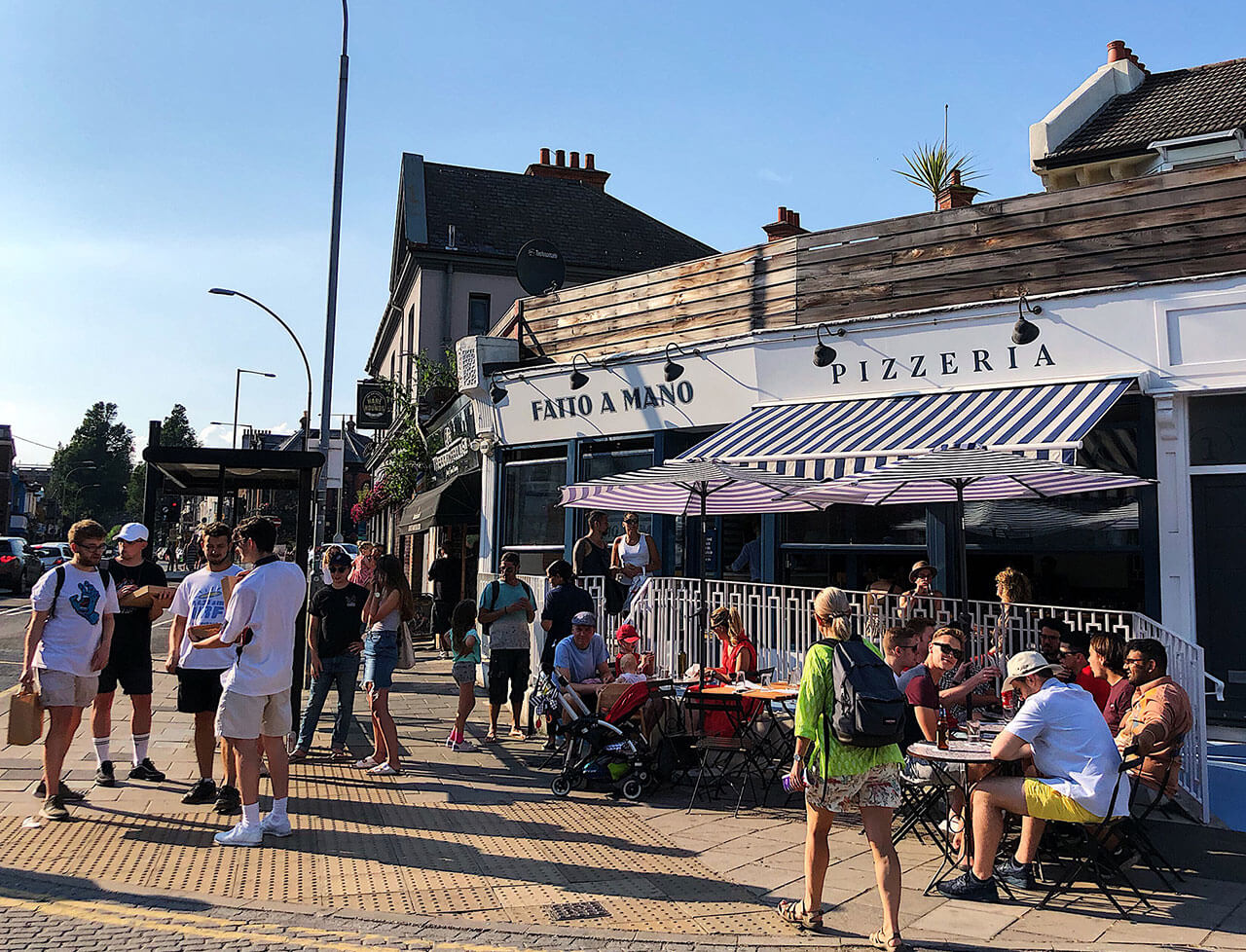 Our original pizzeria on London Road, Brighton is a short walk from Brighton Station and Preston Park, close to Hanover, Queen’s Park and Kemptown. Our neighbours include The Joker, Rose Hill and Hare & Hounds pubs, and the historic Duke of York cinema is around the corner. Walk-in, or click below to book your table.