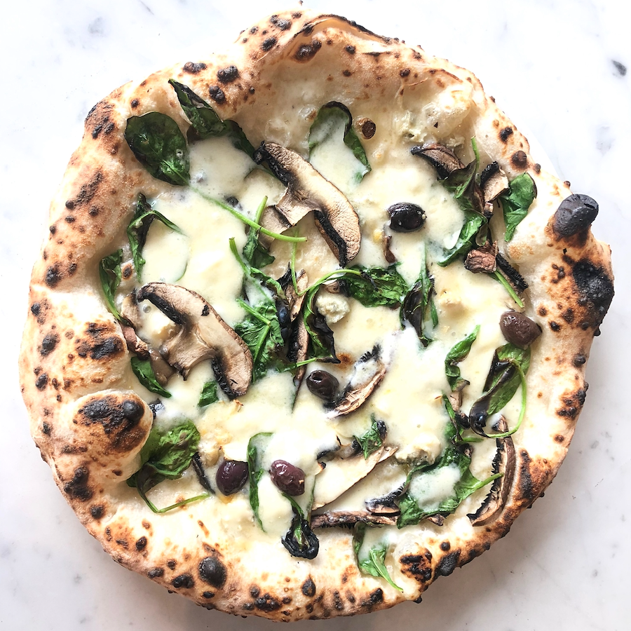 Sussex Blue cheese, portobello mushroom, spinach, roast garlic, black olives, parmesan