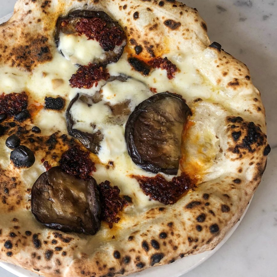 Free range Sussex chorizo, fried aubergine, smoked provola cheese, basil, mozzarella, parmesan.