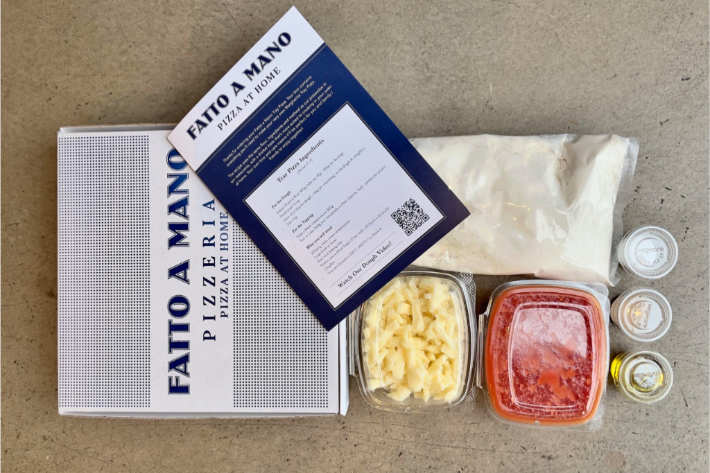 Our kits include flour, tomato and mozzarella from Campania, as well as olive oil, yeast and salt. Just remember you’re making your own pizza from scratch, so the dough needs to be proved for 6 – 10 hours. You can get your Fatto a Mano Pizza at Home kit at our pizzerias in London Rd, Brighton and Church Rd, Hove, or via our website to Click & Collect or for local delivery.